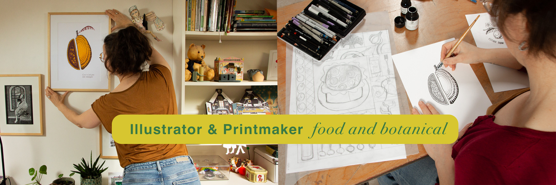 Hi! I'm Esther Tabor - illustrator & print maker with a deep fascination for botanical illustration and food art. I can't help but fill my sketchbooks with plants, vegetables, fruit, insects and playful birds. Sometimes I zoom in on a single subject and give it an unexpected twist like my 'Ceci n'est pas un Mangue' print, but mostly I conjure up rich, detailed ink illustrations and translate them into colourful hand-pulled screen prints. On occasion I will do a small lino cut print as well.