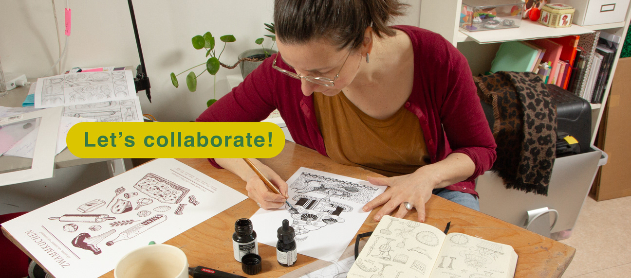 I get inspired by ordinary things, such as vegetables, blossoming trees, garden tools, tiny insects and busy birds. I guess my background as a graphic designer has influenced the way I construct my drawings. I love conjuring up imaginary gardens and silly situations with lots of details. I mostly draw in ink on paper. Little mistakes in the drawing I try to l accept, yet larger ones I glue a piece of paper over it, and continue my drawing. When you look closely some drawings look a little bit like a collage.